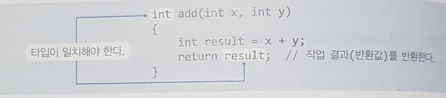 int result = add(3, 5).   //int add(int x, int y)를 호출하고, 결과를 result에 저장