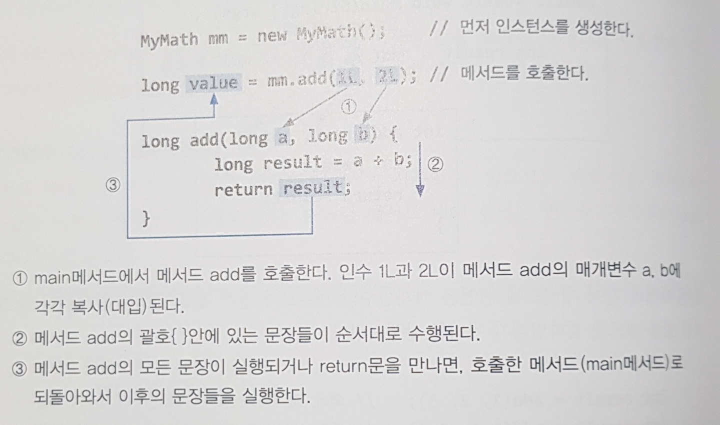 MyMath클래스의 'add(long a, long b)'를 호출하기 위해서는 우선 MyMath클래스의 인스턴스 'MyMath mm = new MyMath();'를 생성한 다음 참조변수 mm을 통해 실행을 진행한다. 이후 add메서드를 호출하고 인수 1L와 2L은 메서드 add의 매개변수 a, b 에 각각 대입된다. 이후 add메서드의 구현부가 수행되고 수행이 끝나면 호출한 메서드로 돌아와 문장을 실행한다.