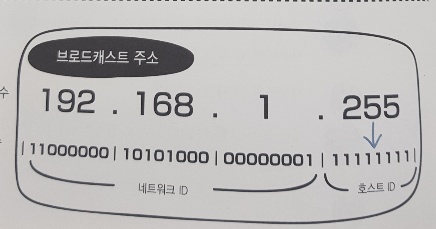 - 브로드캐스트(broadcast): IP 네트워크에 있는 모든 컴퓨터(호스트)로 데이터를 전송하는 방식.