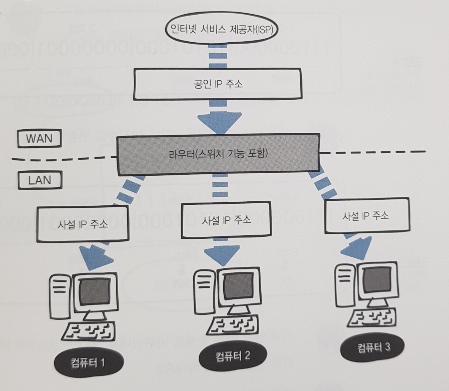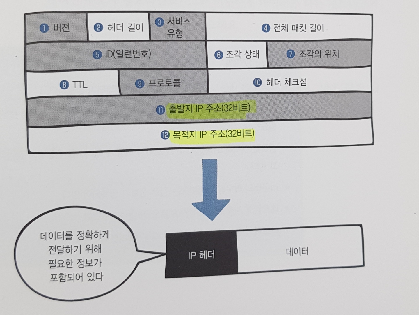 IP주소는 데이터를 다른 네트워크의 목적지로 보내기 위한 주소다. 인터넷 서비스 제공자(ISP)에게 할당되며 IP주소 버전은 IPv4와 IPv6로 나뉜다. 왜 IP주소의 버전은 두 개일까? 처음 IP주소를 만들 때 43개의 주소면 충분하다고 생각했다. 하지만 인터넷 보급의 속도와 양이 늘어나면서 IP 주소 수는 부족해졌고 그 결과 IPv6가 등장하게 됐다. IP주소에는 공인 IP주소와 사설 IP주소가 있다. 앞에서 살펴본 바와 같이 IPv4의 주소 수가 고갈되면서 인터넷에 직접 연결되는 컴퓨터나 라우터에는 공인 IP 주소를, 회사나 가정의 랜에 있는 컴퓨터에는 사설 IP주소를 할당하는 정책을 사용한다. IP주소는 10진수로 표시되어있지만 실제로 IP주소는 2진수로 구성되어있다. 마지막으로 IP주소는 네트워크 ID와 호스트 ID로 나눠져 있으며 네트워크 IP는 '어떤 네트워크'인지를, 호스트 IP는 '해당 네트워크의 어느 컴퓨터'인지를 나타낸다. 이 둘을 합치면 IP 주소가 된다.