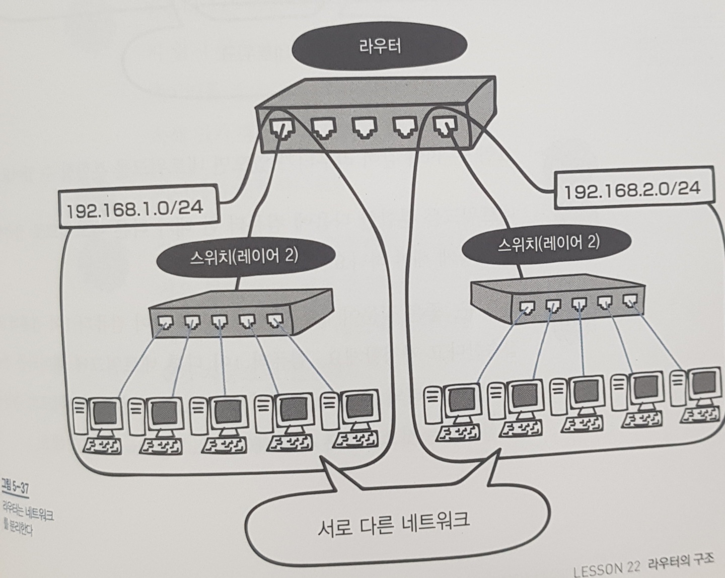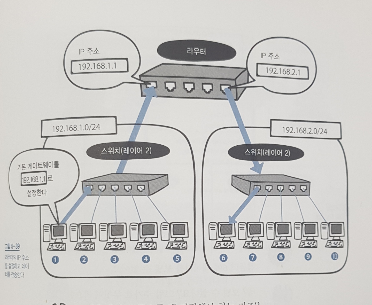 서로 다른 네트워크와 통신하려면 라우터가 필요하다. 라우터는 네트워크를 분리할 수 있다. 라우터는 네트워크를 분리할 뿐 아니라 분리된 네트워크를 서로 통신할 수 있다. 그림과 같이 컴퓨터 1이 컴퓨터 6으로 접속한다고 가정하면, 컴퓨터 1이 다른 네트워크에 데이터를 전송하기 위해 라우터의 IP 주소(192.168.11)를 설정한다. 이는 네트워크의 출입구를 설정하는 것으로 기본 게이트웨이(default gateway)라고 한다. 네트워크의 출입구를 지정하는 방법은 컴퓨터 네트워크의를 설정하는 화면으로 들어가 '자동으로 IP 주소 받기'를 체크한다. 그러면 네트워크 외부에 접속할 때 사용되는 기본 게이트 웨이가 자동으로 설정된다.