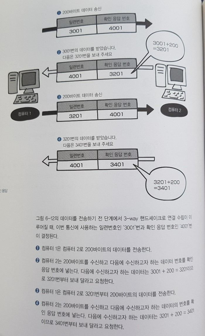 Tree-way HandShake가 끝나고 실제 데이터를 보내거나 상대방이 받을 때는 TCP헤더의 일련번호(sequence number)와 확인 응답 번호(acknowledgement number)를 사용한다. 일련번호는 송신 측에서 수신 측에 '이 데이터가 몇 번째 데이터인지' 알려 주는 역할을 한다. 확인 응답 번호는 수신 측이 몇 번째 데이터를 수신했는지 송신 측에 알려주는 역할을 한다. 다음 번호의 데이터를 요청하는데에도 사용된다.