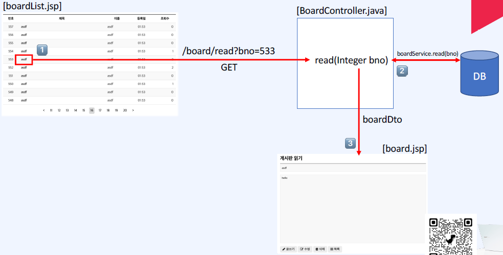①게시판의 게시물(bno=533)을 누르게 되면 '/board/read?bno=533'을 'GET'요청하게 된다. GET요청을 받은 Controller는 read(Integer bno)메서드를 실행하고 ②'boardService.read(bno)'가 호출된다. boardService메서드로 인해 DB에서 bno=533에 해당하는 데이터를 읽어오고 Controller는 이것을 boardDto에 담아 board.jsp로 보낸다.