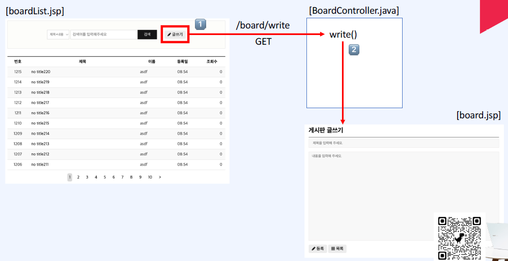 글쓰기를 누르면 Controller에 /board/write 'GET' 요청이 간다. GET요청을 받은 Contoroller는 write()를 호출하고 board.jsp를 보여준다. 여기서 주목해야 할 점이 있다. board.jsp를 보여줄 때 게시글을 보여주는 '게시판 읽기'와 게시판의 글을 쓰는 '게시판 글쓰기' 두 가지의 경우의 수가 나온다. '게시글 읽기'는 말 그대로 읽기만 가능하기 때문에 'readonly'로 설정해준다. 이 두 경우의 수를 구분해야하는데 이를 위해 글쓰기일 때는 'mode=new'로 표시하여 구분한다. Controller의 write()는 모델의 mode값을 new로 담아 board.jsp로 보낸다. 그러면 board.jsp는 mode에 담긴 값이 new이면 글쓰기 모드로 보여주고, mode의 값이 new가 아니면 읽기 전용 페이지인 readonly가 표시된 화면을 보여준다.