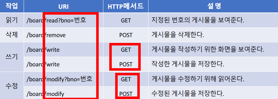 CRUD를 수행하기 위해 기능별로 URL를 살펴보면 '/'이후 기능별로 URI가 다른 걸 확인할 수 있다. 메서드도 다른데 크게 GET과 POST로 메서드를 사용한다. 'GET'은 정보를 불러오는 데에 메서드로 쓰이고 'POST'는 정보를 입력하는데에 메서드가 쓰인다. 여기서 주목해야 할 점은 쓰기와 수정에서 GET,POST가 모두 쓰인다는 점이다.