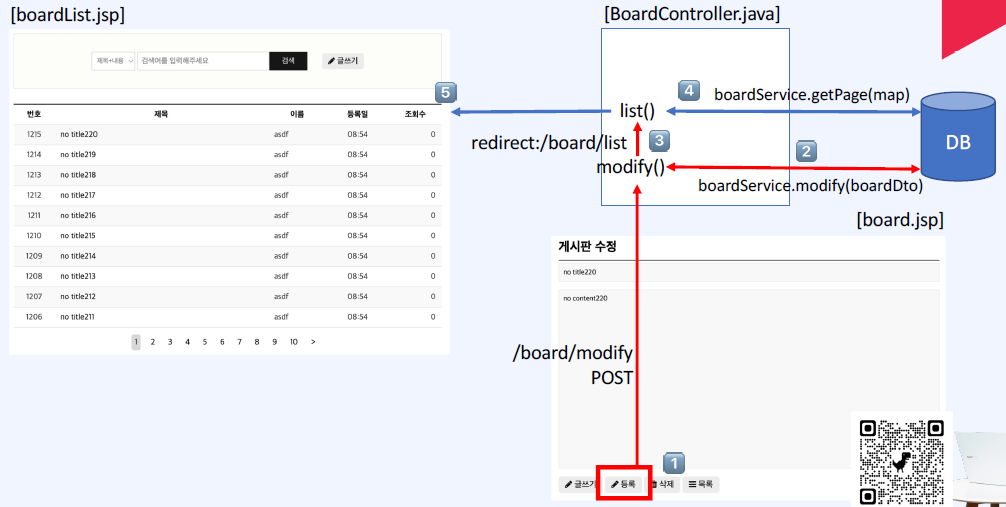 흐름은 Write과 동일하다. 등록 버튼을 누르면 POST요청을 하고 Controller에서 modify()를 호출한다. 그러면 boardService.modify를 통해 변경된 값이 DB에 저장된다. modify()는 Redirect로 list()를 호출하고 boardService.getPage()를 통해 DB에서 페이지 정보를 받아온다. 그리고 게시판의 첫 번째 화면을 보여준다.