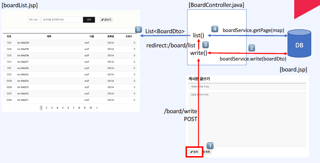 게시판에 쓴 글을 등록 버튼을 눌러 Controller에 write()를 호출한다.하지만 여기에서 호출하는 write는() 앞에서 본 write()는 달리 'GET'매핑이 아니라 'POST' 매핑으로 되어있다. write()가 호출되면 글쓰기 쓰여진 값을 DB에 저장한다. DB에 저장된 값을 wirte()는 boardService.write(boardDto)를 통해 받고 Redirect를 통해 list()에게 전달한다. list()는 boardService.getPage(map)을 호출하여 DB에서 페이지의 값을 넘겨받고 페이지 값에 맞는 게시판 목록 화면을 보여준다.