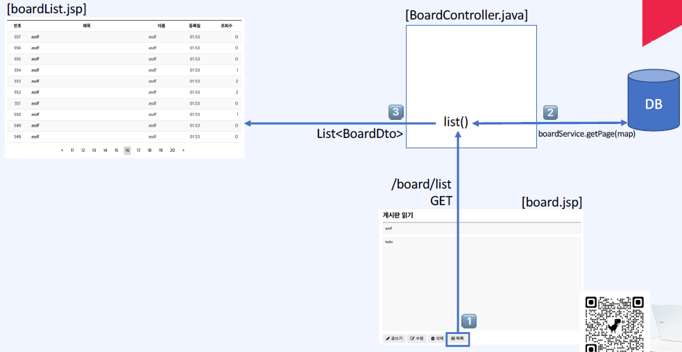 bno=533에 해당하는 게시판을 읽고 다시 게시판으로 돌아가기 위해 목록 버튼을 누른다. ①목록 버튼을 누르면 BoardController로 /board/lsit 'GET'요청이 간다.Controller에서는 list()가 호출되고 list()는 페이지의 정보인 boardService.getPage(map)을 호출한다. 그러면 DB를 통해 해당 페이지의 데이터를 boardDto에 담아 Controller로 반환한다. 데이터는 list<BoardDto>에 담기고 처음 게시판의 위치로 화면이 이동한다.