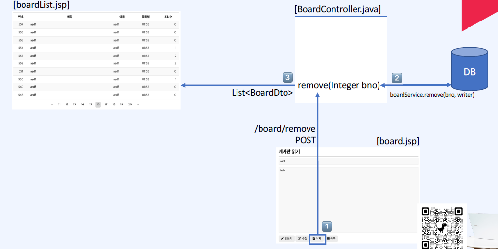 ①삭제를 누르면 /board/remove 'POST'요청을 한다. Contoller에서는 remove()가 호출되고 remove메서드는 ② boardService.remove(bno,writer)를 호출한다. 여기서 주목해야 할 점은 'writer'를 함께 호출했다는 점이다. 삭제와 수정은 오직 글쓴이만 삭제하고 수정할 수있다. 그래서 DB에서 writer의 정보도 함께 가져온다. 이 정보를 통해 삭제를 요청한 writer와 DB의 writer가 맞으면 해당 게시물의 remove메서드가 실행되고 ③Redirect를 통해 Controller는 list메서드를 호출한다. list()는 다시 DB로부터 페이지의 정보를 받고 이를 boardDto에 담아 처음 게시물의 page로 화면을 이동한다.