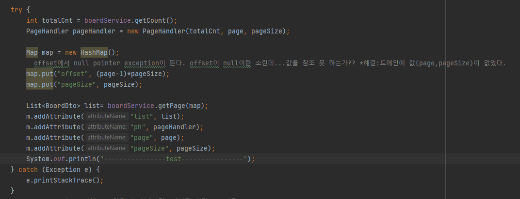①-2. 확인결과 console에서는 '------------------test------------------'값이 잘 찍혔습니다. Controller까지 이동하는데에는 문제가 없음을 확인했습니다. 여기서 저는 list()에서 과정에서는 문제는 없고 return값인 boardList로 이동하는 과정에 문제가 생겼다는 결론을 내렸습니다.