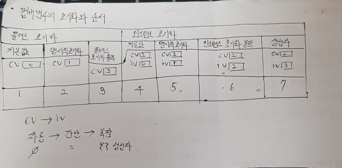 - 클래스 변수(cv) 초기화 → 인스턴스 변수(iv) 초기화