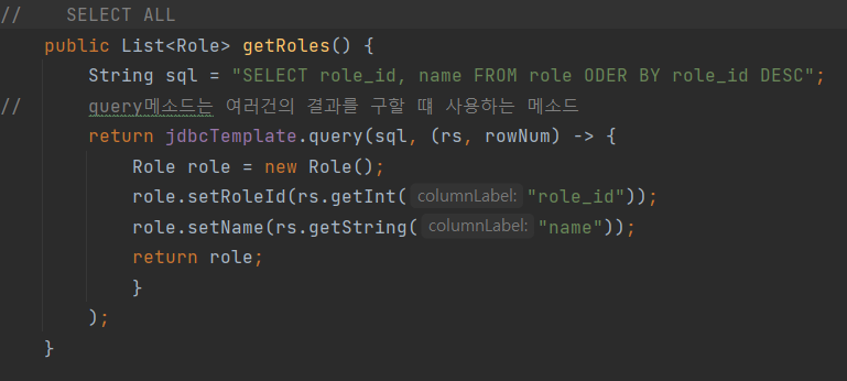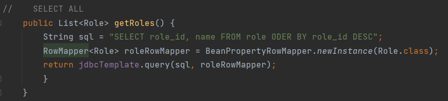 RowMapper의 구현체 BeanPropertyRowMapper.newInstance(Role.class)가 RowMapper의 역할을 대신한다. 즉, 기존에 사용했던 람다표현식을 대체한다.