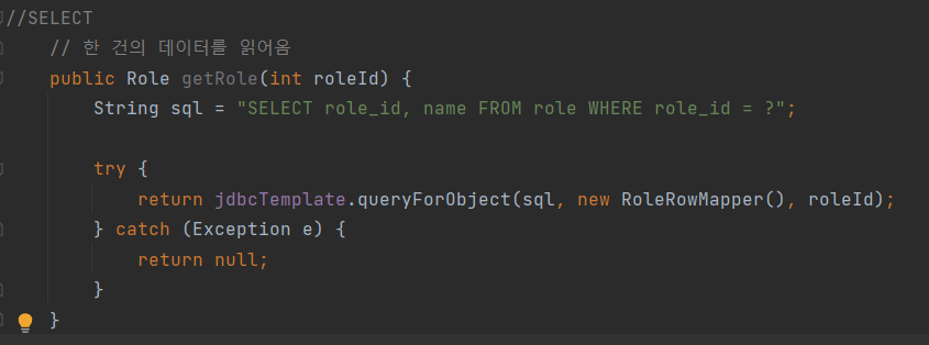 - SELCT SQL을 실행하여 하나의 Row를 가져올 때는 queryForObject() 메서드를 사용한다.