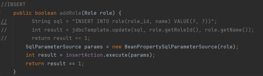 ③변수 insertAction는 INSERT INTO role(role_id, name) VALUES(:roleId, :name)를 SimpleJdbcInsert을 통해 내부에 쿼리를 만든다. SqlParameterSource에서 뽑아낸 파라미터 값(roleId, name)을 insertAction.execute매개변수로 넣으면 '?'이 매핑됨과 동시에 SQL문이 실행된다.