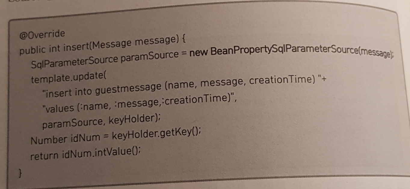 :NamedParameterJdbcTemplate은 JdbcTemplate과 동일한 기능을 제공한다. 하지만 인덱스 기반의 파라미터로 설정하는 JdbcTemplate과 달리 NamedParameterJdbcTemplate은 이름 기반의 파라미터를 설정한다.