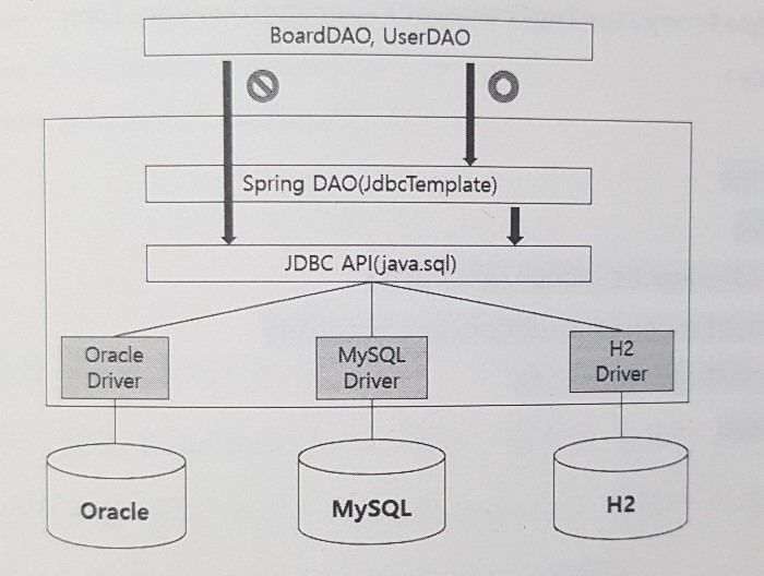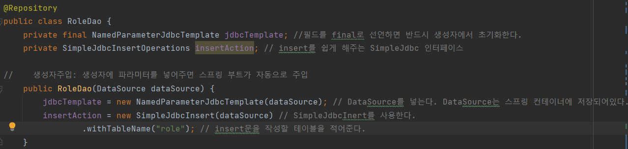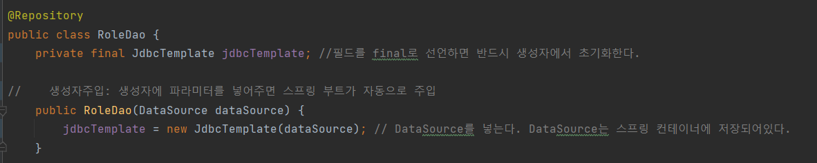 - DataSource는 보통 Bean으로 등록해서 사용하므로 JdbcTamplate이 필요한 DAO 클래스에서 DataSource Bean을 DI 받아서 JdbcTemplate을 생성할 때 인자로 넘긴다.