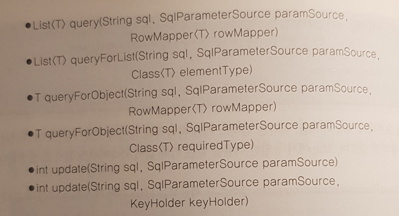 - MapSqlParameterSource : Map과 비슷하게 <이름, 값> 쌍을 이용해서 파라미터 값을 설정한다.