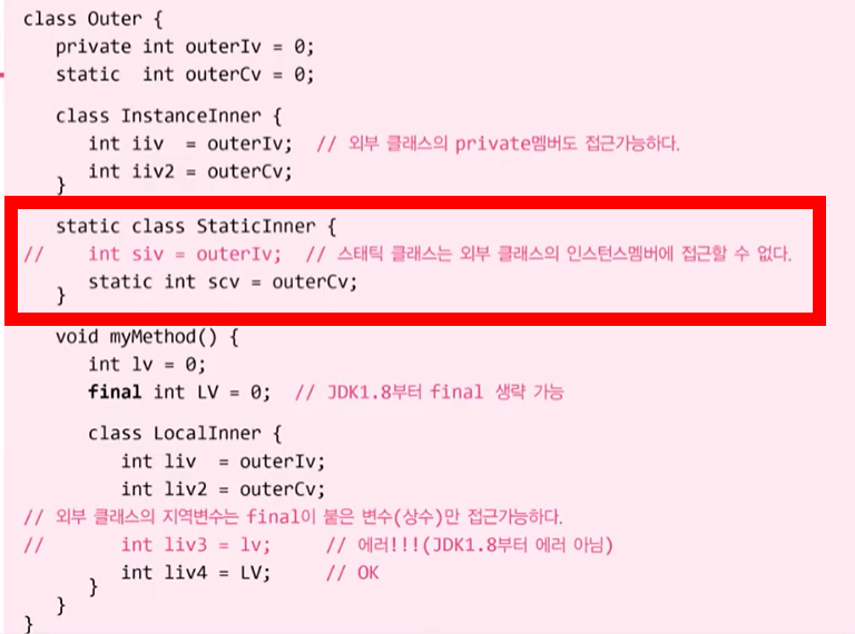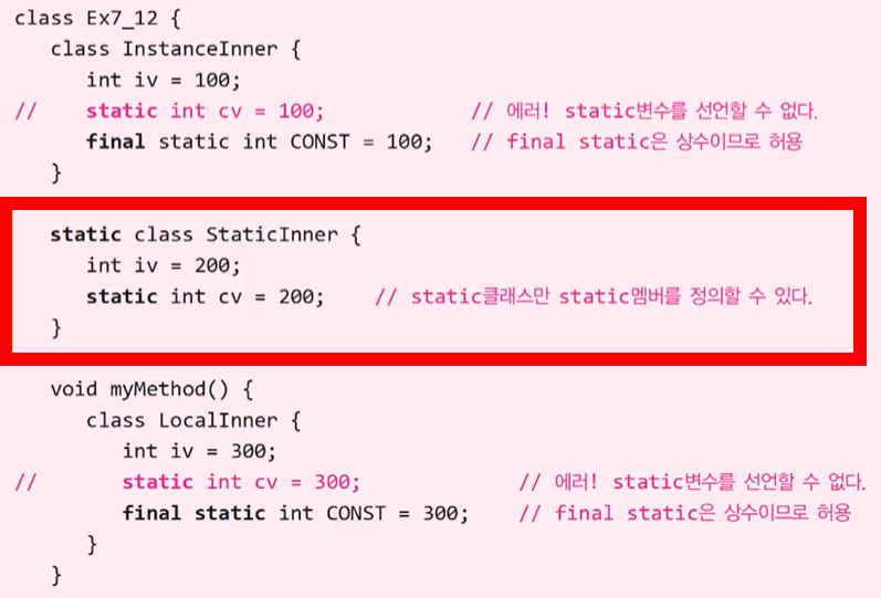 - static내부 클래스만 static멤버를 정의할 수 있다.