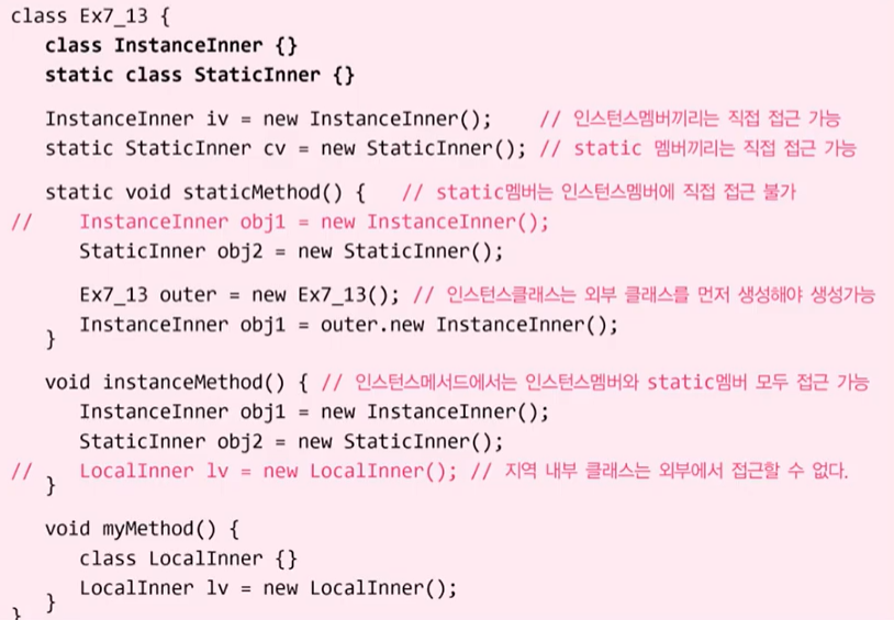 - 내부 클래스는 외부 클래스의 private멤버도 접근 가능하다.