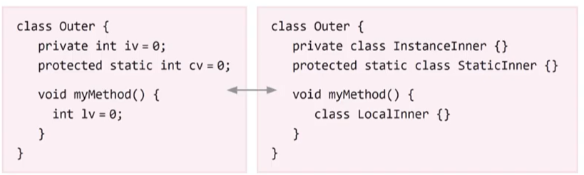 내부 클래스의 종류와 유효범위는 변수와 동일하다.