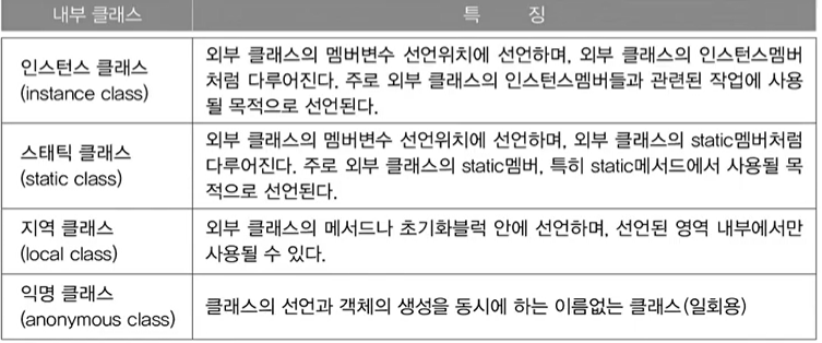 내부 클래스의 종류와 유효범위는 변수와 동일하다.