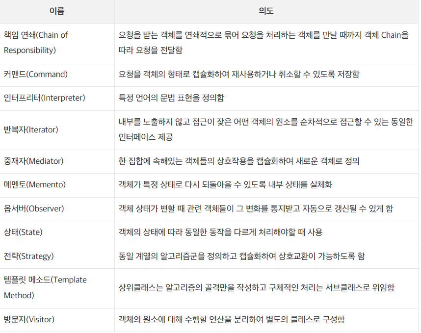 :클래스나 객체들이 서로 상호작용하는 방법이나 어떤 태스크, 어떤 알고리즘을 어떤 객체에 할당하는 것이 좋을지 정의하는 패턴이다. 즉, 객체나 클래스의 교류방법에 대해 정의한 것이다. 행위 패턴은 하나의 객체로 수행할 수 없는 작업을 여러 객체로 분배하면서 그들간의 결합도를 최소화 할 수 있도록 도와준다. 행위 클래스 패턴은 상속을 통해 알고리즘과 제어 흐름을 기술하고, 행위 객체 패턴은 하나의 작업을 수행하기 위해 객체 집합이 어떻게 협력하는지를 기술한다.