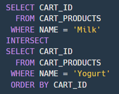 - 'Milk와 Yogurt를 동시에 구입한다'는 조건을 어떻게 표현할 지 생각해내지 못했다. 집합으로 이해하면 쉽게 풀어나갈 수 있다. 상품 종류가 'Milk', 'Yogurt'를 동시에 만족해야한다. 그렇다면 집합연산자 'INTERSECT'를 사용하여 두 조건을 동시에 만족하는 테이블을 얻을 수 있다.