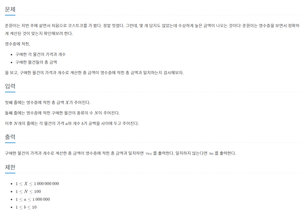 if(total == X) { // 구매한 물건 총 금액과 영수증에 적힌 금액의 합이 같다면