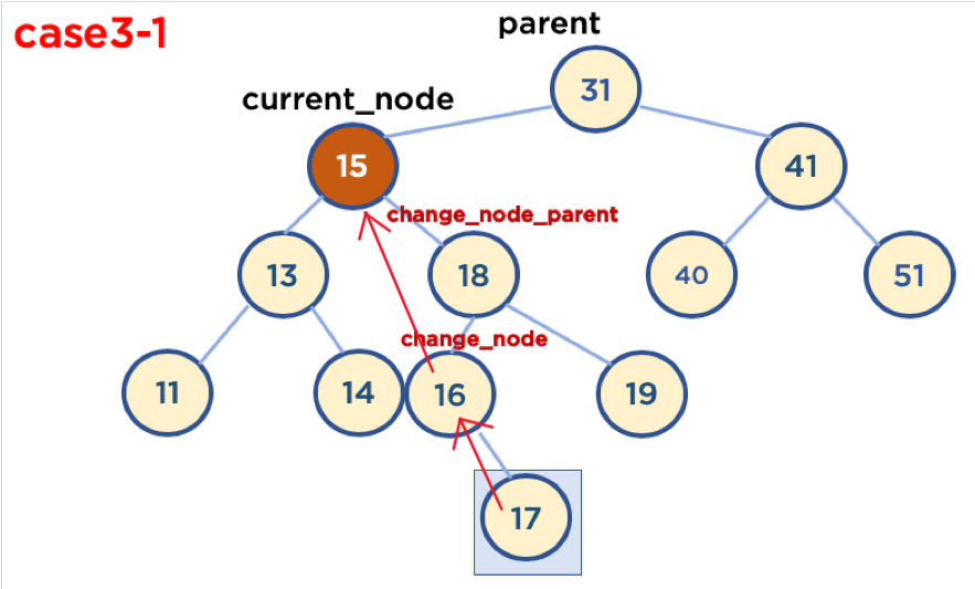 Case3-1-2.삭제할 Node가 Parent Node의 왼쪽에 있고, 삭제할 Node의 오른쪽 자식 중, 가장 작은 값을 가진 Node의 오른쪽에 Child Node가 있을 때 -> 가장 작은 값을 가진 Node의 Child Node가 왼쪽에 있을 경우는 없음, 왜냐하면 왼쪽 Node가 있다는 것은 해당 Node보다 더 작은 값을 가진 Node가 있다는 뜻이기 때문임