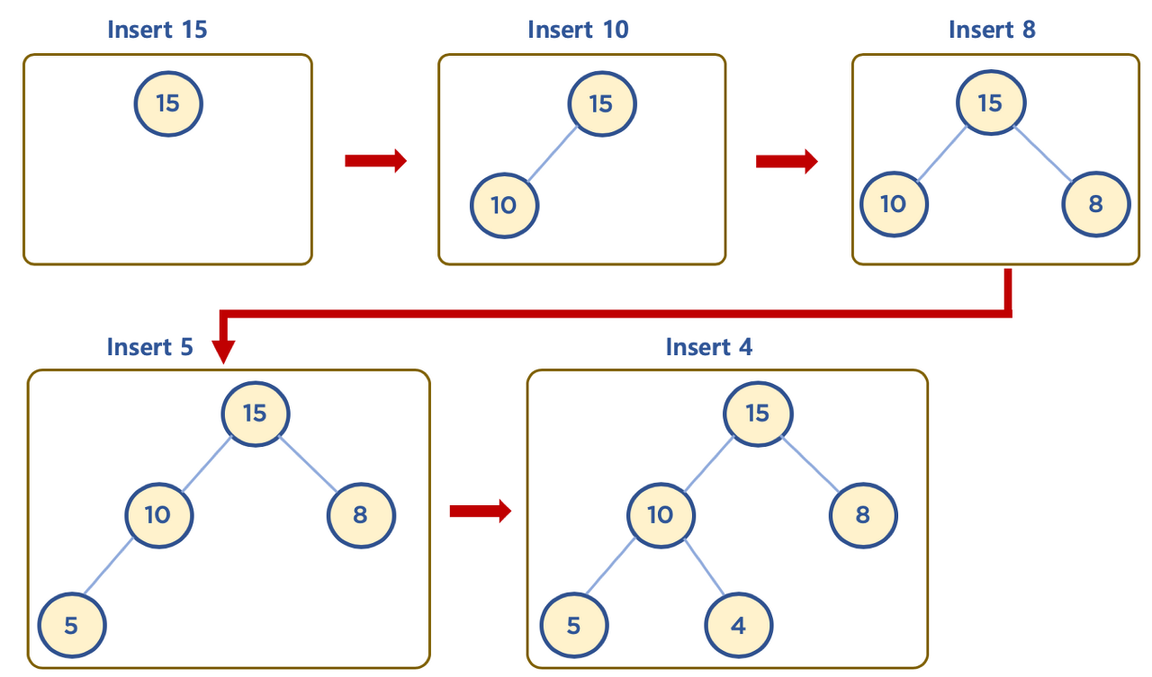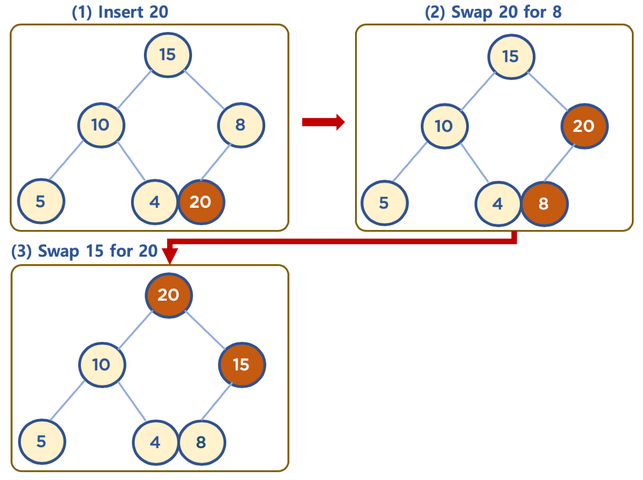 :채워진 노드 위치에서 부모 노드보다 값이 클 경우, 부모 노드와 위치를 바꿔주는 작업을 반복한다.