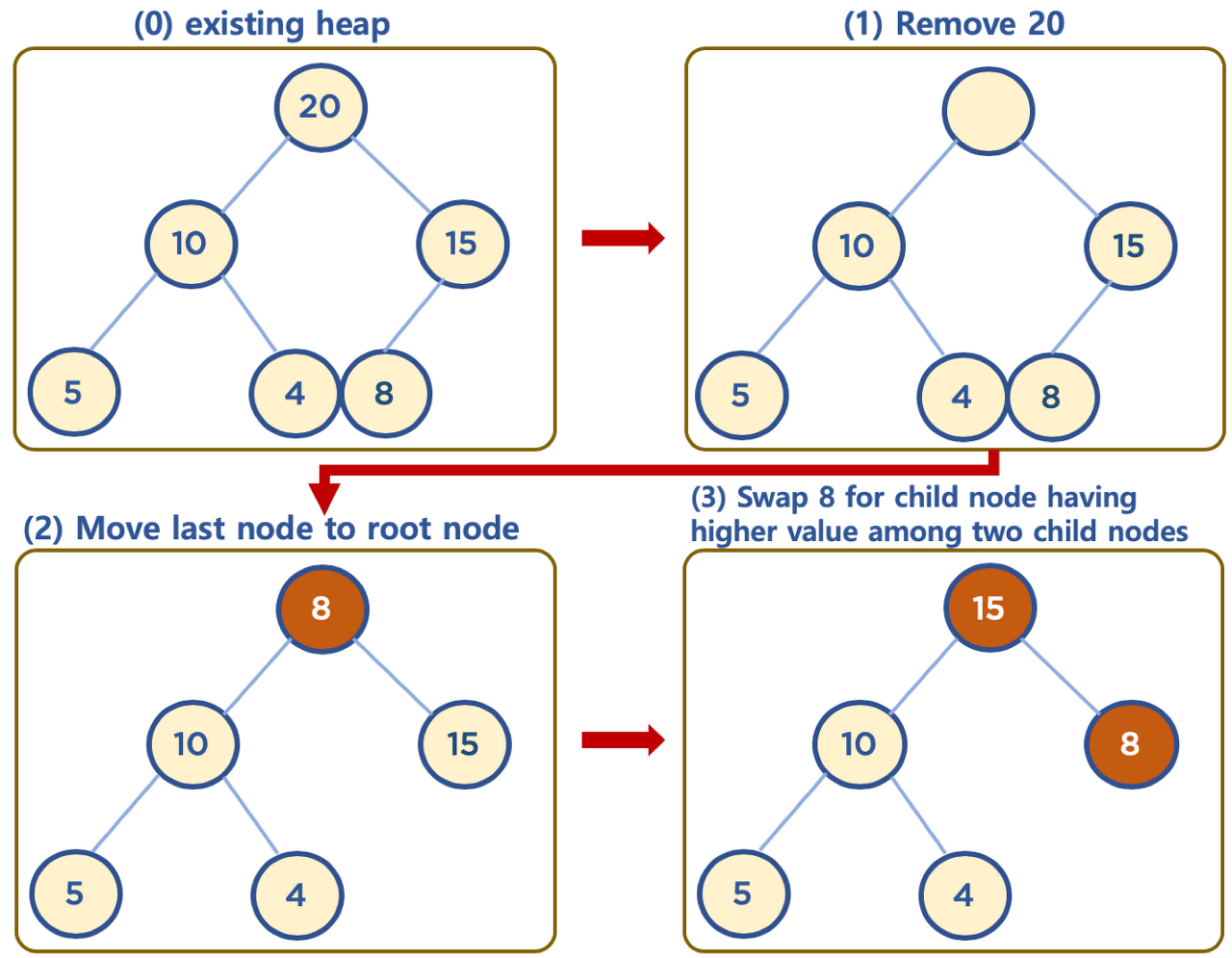 - root 노드의 값이 child node 보다 작을 경우, root 노드의 child node 중 가장 큰 값을 가진 노드와 root 노드 위치를 바꿔주는 작업을 반복함 (swap)