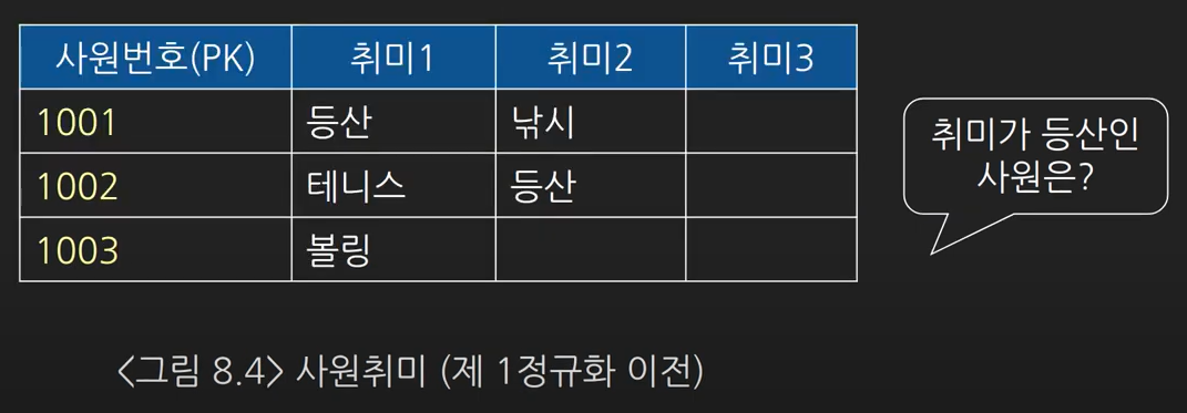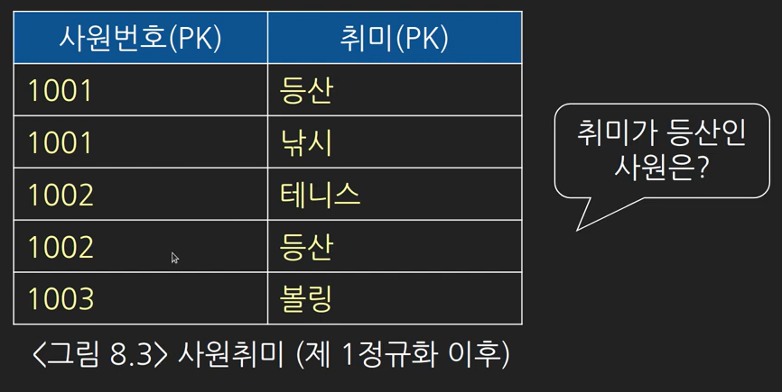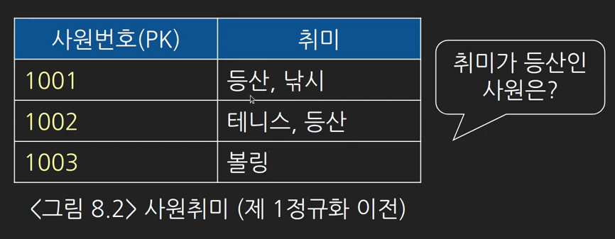 - 엔티티에서 하나의 속성이 여러개의 값을 갖도록 설계되어있을 때 하나의 속성이 하나의 값을 갖도록 설계를 변경하는 과정