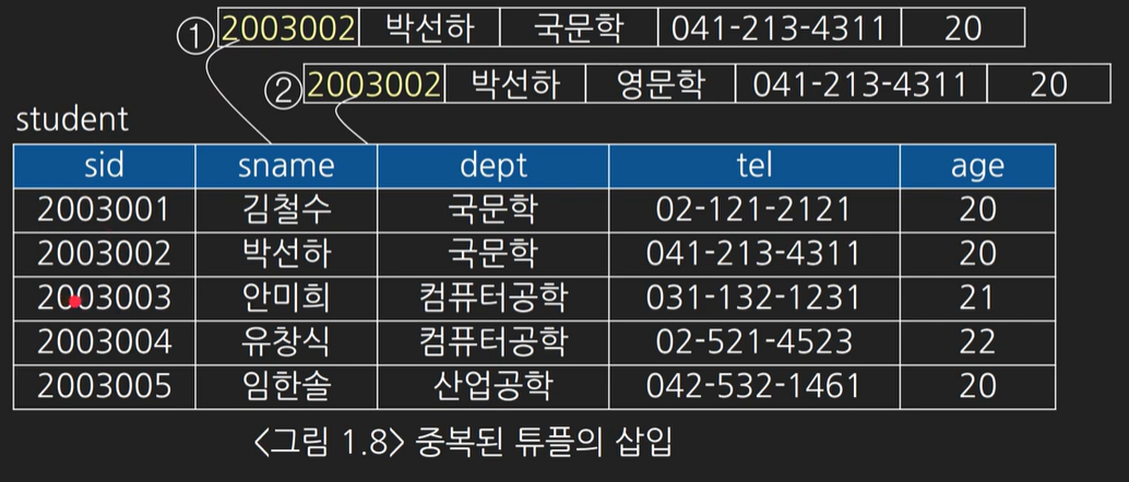 :많은 양의 데이터들은 중복될 위험성이 있다. Student 테이블을 보면 학번이 2003002인 데이터는 dept가 국문학과 영문학으로 중복되는 데이터를 가지고 있다. 그럼 학번이 2003002인 박선하 학생은 학과가 국문학, 영문학 두 개를 가진 오류를 범하게 된다. 이를 위해 Key는 중복된 데이터를 막는다.