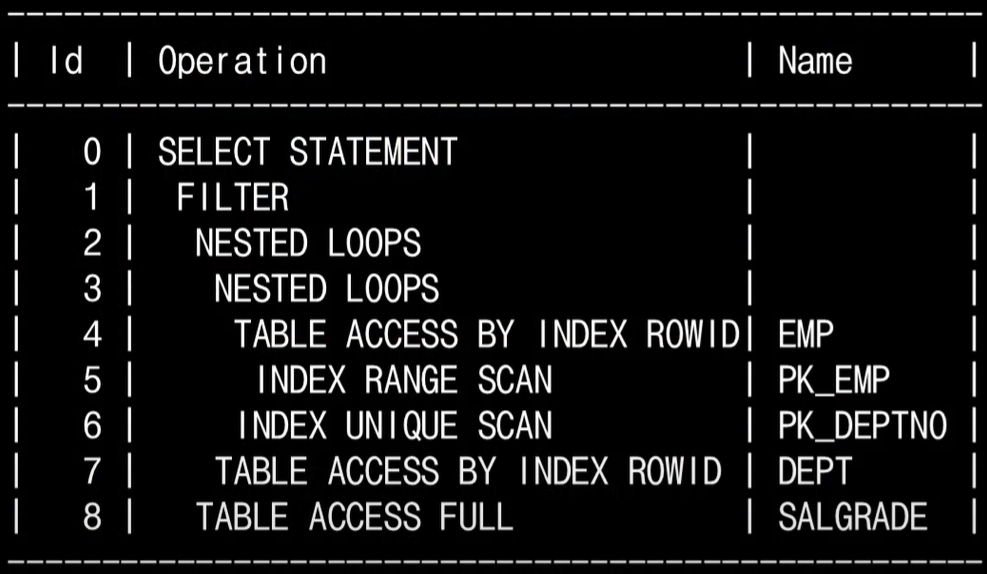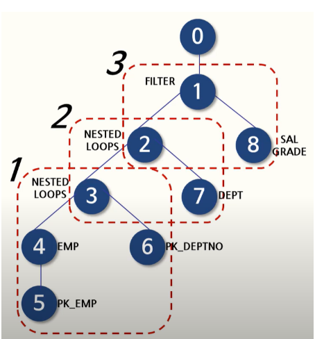 위의 예제에 따르면 5->4->6->->3->7->2->8->1->0 순서로 실행계획이 진행되고 읽어야 한다.