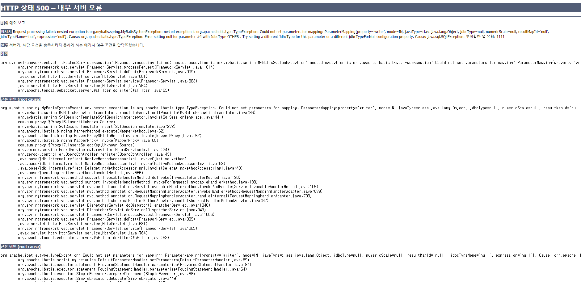 SEVERE: 경로 []의 컨텍스트 내의 서블릿 [appServlet]을(를) 위한 Servlet.service() 호출이, 근본 원인(root cause)과 함께, 예외 [Request processing failed; nested exception is org.mybatis.spring.MyBatisSystemException: nested exception is org.apache.ibatis.type.TypeException: Could not set parameters for mapping: ParameterMapping{property='writer', mode=IN, javaType=class java.lang.Object, jdbcType=null, numericScale=null, resultMapId='null', jdbcTypeName='null', expression='null'}. Cause: org.apache.ibatis.type.TypeException: Error setting null for parameter #4 with JdbcType OTHER . Try setting a different JdbcType for this parameter or a different jdbcTypeForNull configuration property. Cause: java.sql.SQLException: 부적합한 열 유형: 1111]을(를) 발생시켰습니다.