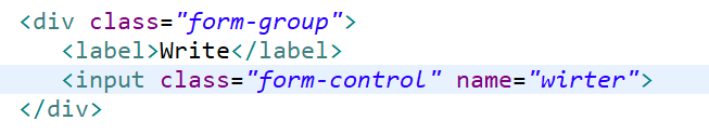 메세지를 살펴보면 writer에 Null이 났으니 확인해보라는 메시지를 확인할 수 있다. 실습을 진행하던 중 설계 부분에서는 테스트 코드를 이상없이 진행하였으므로 문제가 생겼으면 jsp에서 생겼을 것이다. 그러면 jsp에서 writer가 controller로 어떻게 넘어가는지, form이 잘 쌓여있는지, 오타가 없는지 확인했다. 그 결과 'writer'라고 써야 할 부분이 'wirter'로 쓰인걸 확인할 수 있었다.