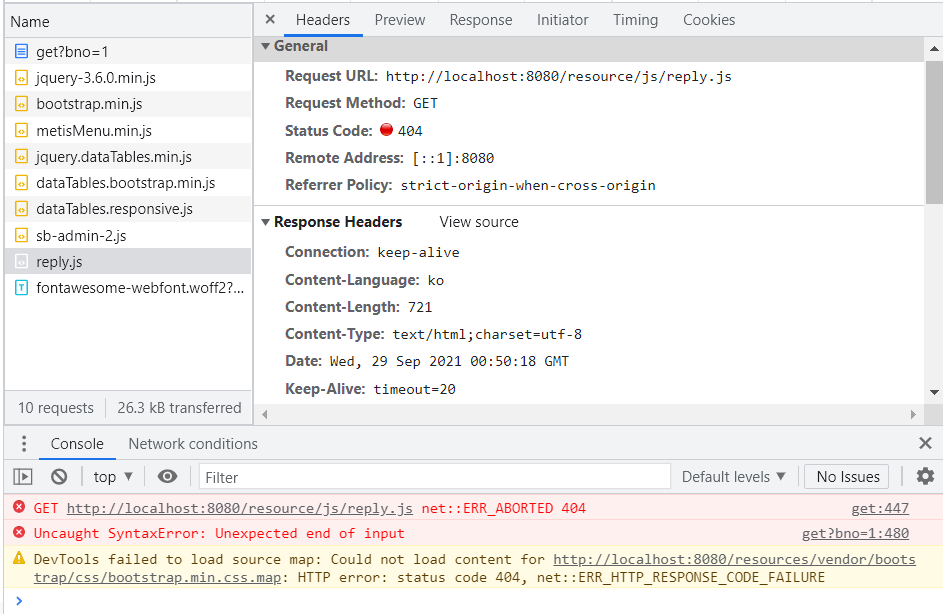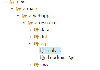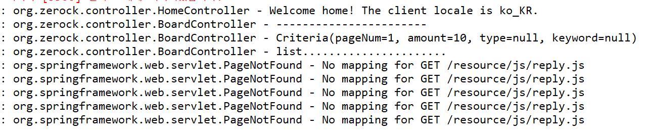 reply.js파일이 내가 get.jsp에 작성한 resource/js/reply.js로 되어있지 않고 resources/js/reply.js 로 되어있었다. 's'하나의 오타떄문에 문제가 발생한거다. No mapping 에러 메시지가 뜨면 우선 경로가 맞는지 확인해보자.