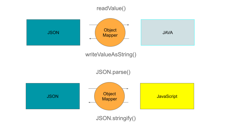 : JSON을 JAVA 혹은 JS객체로, 혹은 JAVA,JS객체를 JSON 객체로 변경할 수 있다. 이를 가능하게해주는 건 Obejct매퍼로 Jackson DataBind 라이브러리를 통해 사용할 수 있다.