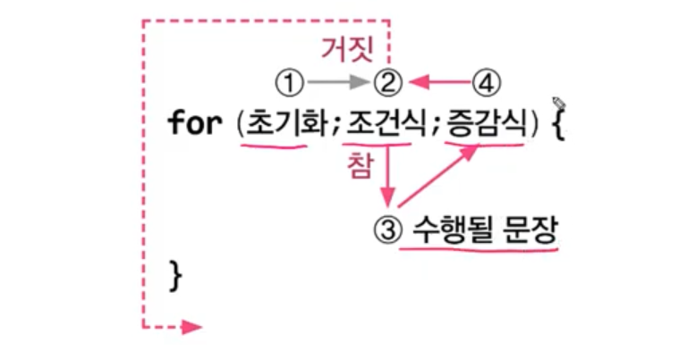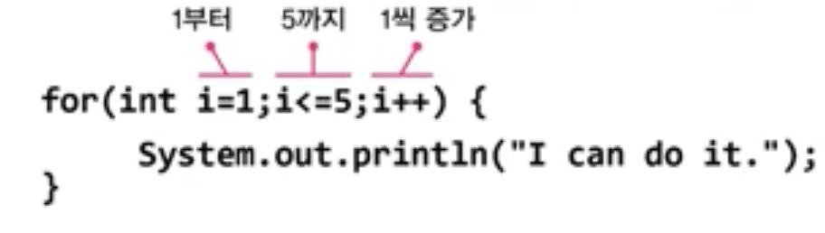 for(int i=1;i<=10;i++) { ... } // 'i<=10'가 참인 동안 블럭{}안의 문장들을 반복