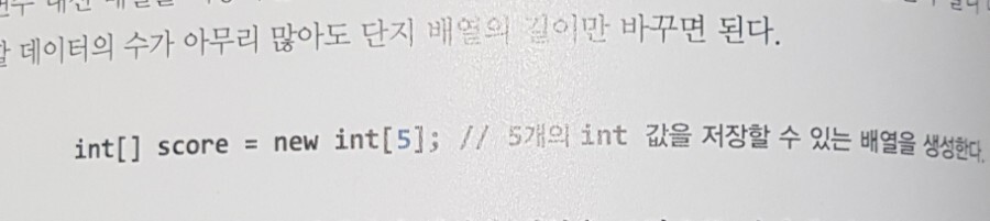 score1, score2, score3, score4, score5로 선언된 변수를 배열을 사용하면 위와 같이 하나의 코드로 묶을 수 있다. 다만, 배열을 사용하기 위해선 '같은 타입'이어야 한다는 조건이 있다.
