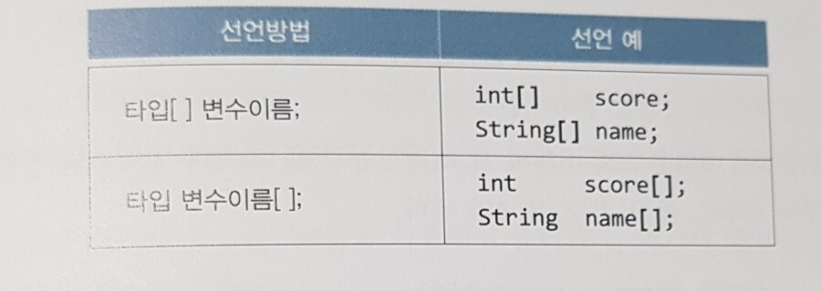 배열을 선언하는 방법은 두 가지가 있다. '타입 [] 변수이름;'과 '타입 변수이름[];' 두 방법이다. 두 방법 모두 쓰이지만 앞의 방법을 주로 사용한다.