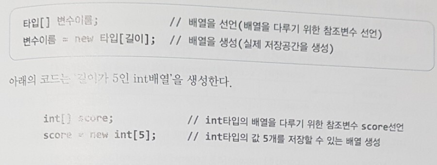 배열을 선언한 다음에는 배열을 생성해야만 한다. 배열을 선언했다는 것은 단지 생성된 배열을 다루기 위한 참조변수의 공간을 만든 것일 뿐이고, 배열을 생성해야만 비로소 값을 저장할 수 있는 공간이 만들어진다.