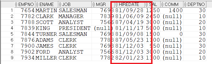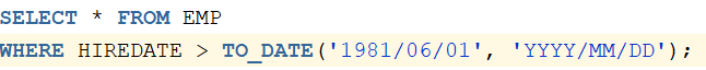 위와 같이 문자열이 해당 날짜 데이터로 출력된 것을 확인할 수 있다. 날짜 데이터는 간단한 연산이 가능하다. 예를 들어 입사일(HIREDATE)이 1981년 6월 1일 이후인 사원들을 찾는 쿼리문을 작성하면 아래와 같다.