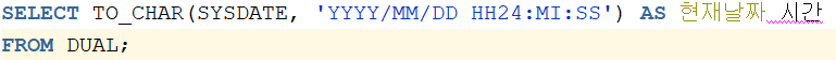 현재 날짜와 시간을 '연/월/일 시:분:초' 형태로 출력하려한다면, 다음과 같이 SELECT문에 TO_CHAR함수를 사용할 수 있다.
