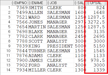 EMP 테이블에서 직책이 MANAGER인 사람은 급여의 10%를 인상한 급여, SALESMAN인 사람은 급여의 5%, ANALYST인 사람은 그대로, 나머지는 3%만큼 인상된 급여를 보여주는 쿼리문을 DECODE함수를 사용하여 작성해보자.