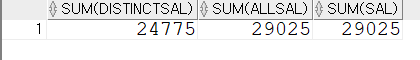 SUM 함수를 생략 가능한 옵션 DISTINCT와 ALL을 사용하여 쿼리문을 작성해보자.