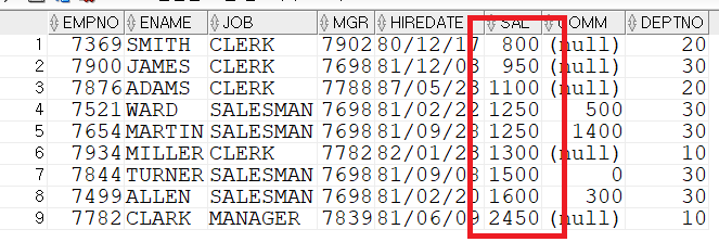 이번에는 반대로 30번 부서 사원들의 최소 급여(SAL=950)보다 많은 급여를 받는 사원의 정보를 출력해보자.