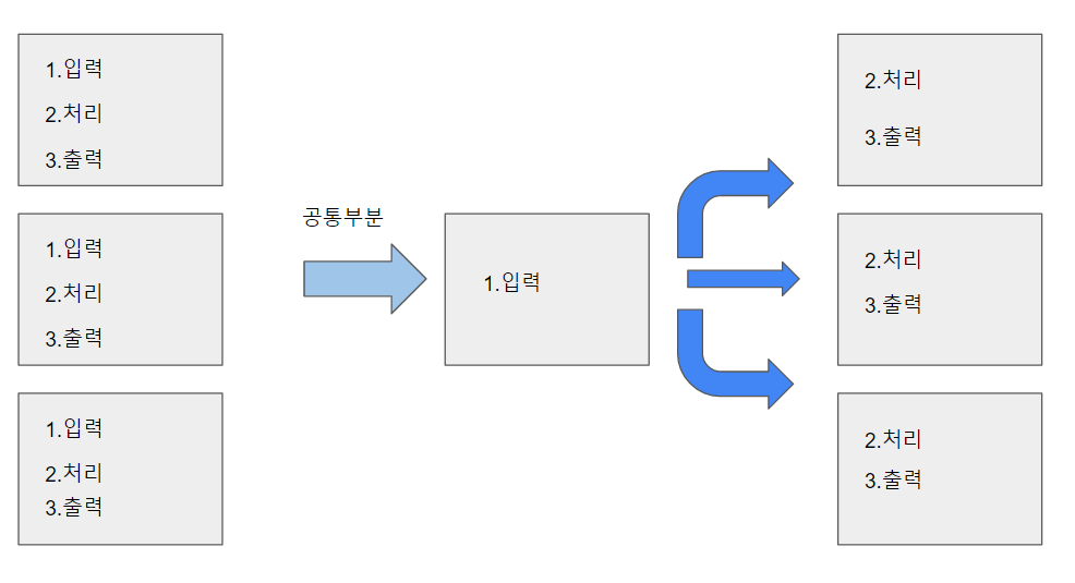 공통코드를 분리해보자. '입력'을 담당하는 부분을 따로 떼내어놓으면 나머지 작업에서는 처리와 출력 두 작업만 수행하면된다. 코드에서는 어떻게 나타낼 수 있을까??
