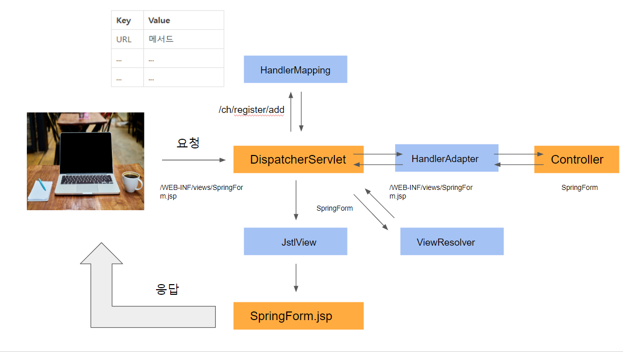 클라이언트로부터 URL요청이 들어오면 DispatcherServlet은 HandlerMapping에게 URL에 알맞는 메서드 찾기에 대한 책임을 넘기고 HandlerMapping은 URL에 알맞은 메서드 정보를 DispatcherServlet에게 넘긴다. URL에 맞는 메서드 정보를 받은 DispatcherServlet은 메서드를 호출한다.