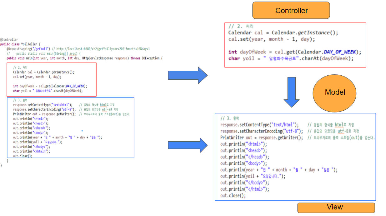 위의 이미지에서 왼쪽 코드는 클래스 안에 출력하는 코드가 있지만 분리하면 다른 클래스(대부분 jsp를 쓴다)로 나눠 쓸 수 있다. 출력 코드가 같은 클래스에 있을 때는 상관없지만 다른 영역으로 이동하면 매개변수가 달라 출력에 쓰일 데이터를 넘겨줄 수 없다. 이를 위해 모델 객체에 값을 담아 view로 넘겨준다. 왼쪽 그림과 같이 코드의 로직을 처리하는 부분(Controller)와 값을 담는 모델(Model), 그리고 화면을 보여주는 View를 보여주는 코드를 나눈 패턴을 우리는 MVC패턴이라한다.